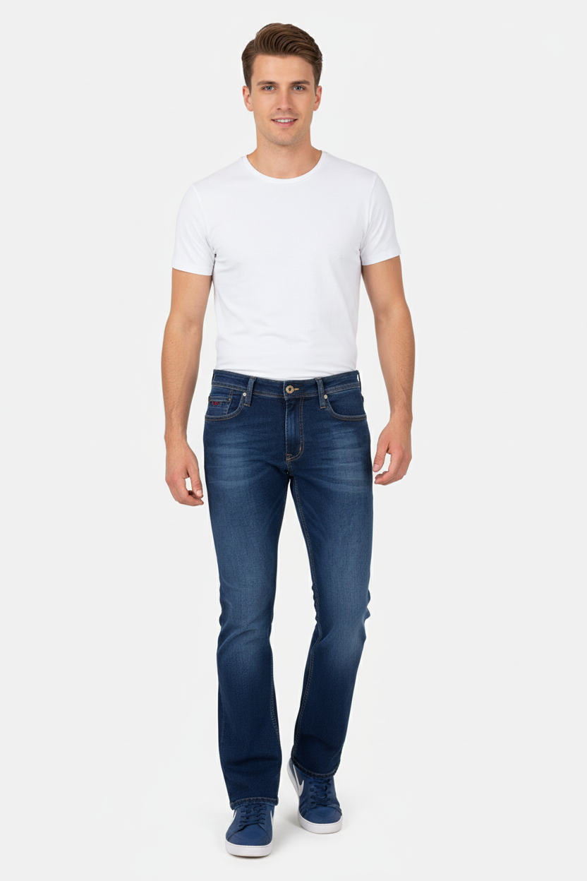 Crafted with 98% premium compact silk-touch cotton and 2% elastane, these bootcut stretch men's jeans offer the perfect fit and freedom of movement.
